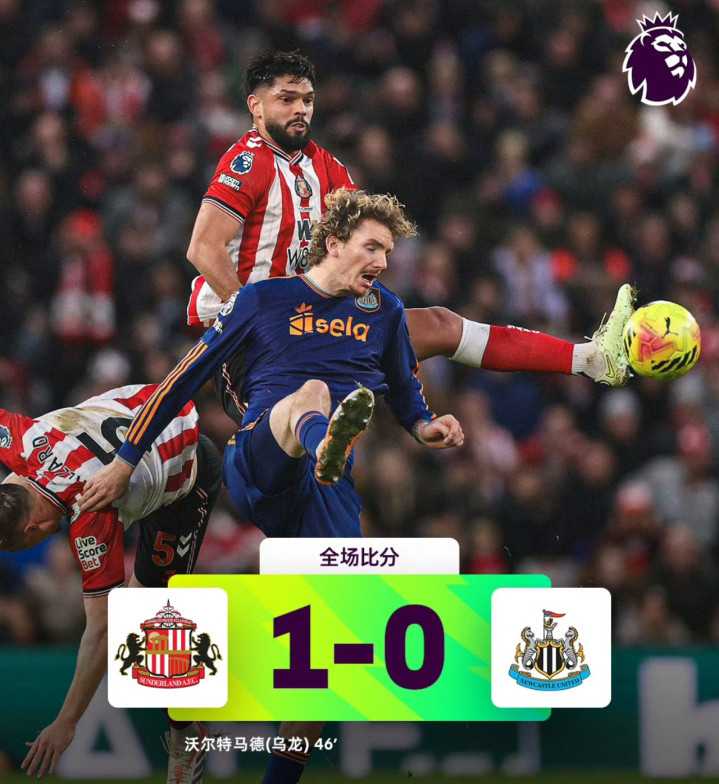 此后比赛中,纽卡斯尔联多次调整阵容,试图扳平比分,但桑德兰防守稳固,始终守住领先优势,最终1-0获胜,拿下德比战胜利。