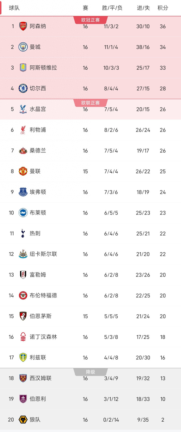 25/26赛季英超第16轮多场关键对决陆续落幕,积分榜格局迎来小幅调整。