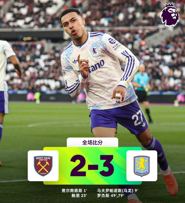 12月14日,英超第16轮另一场对决,西汉姆联主场迎战阿斯顿维拉,这场比赛剧情跌宕起伏,最终阿斯顿维拉客场3-2逆转获胜,豪取各项赛事9连胜。