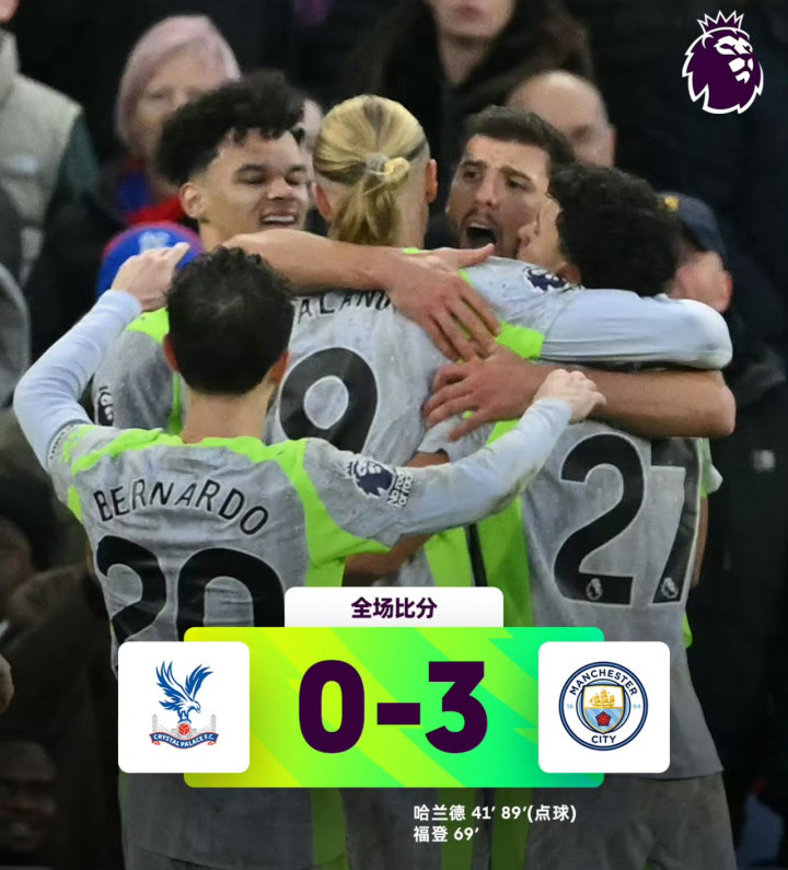 曼城3-0水晶宫:哈兰德双响,福登贴地斩锁定胜局