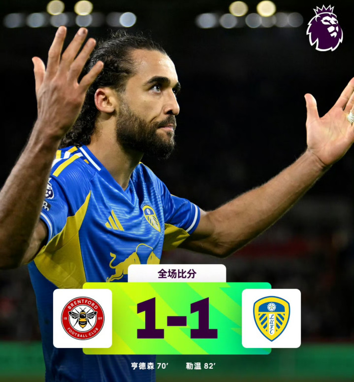 82分钟,利兹联终于迎来扳平时刻,勒温禁区内高高跃起,头球攻门命中,皮球直入死角,比分改写为1-1,利兹联完成绝平救主。